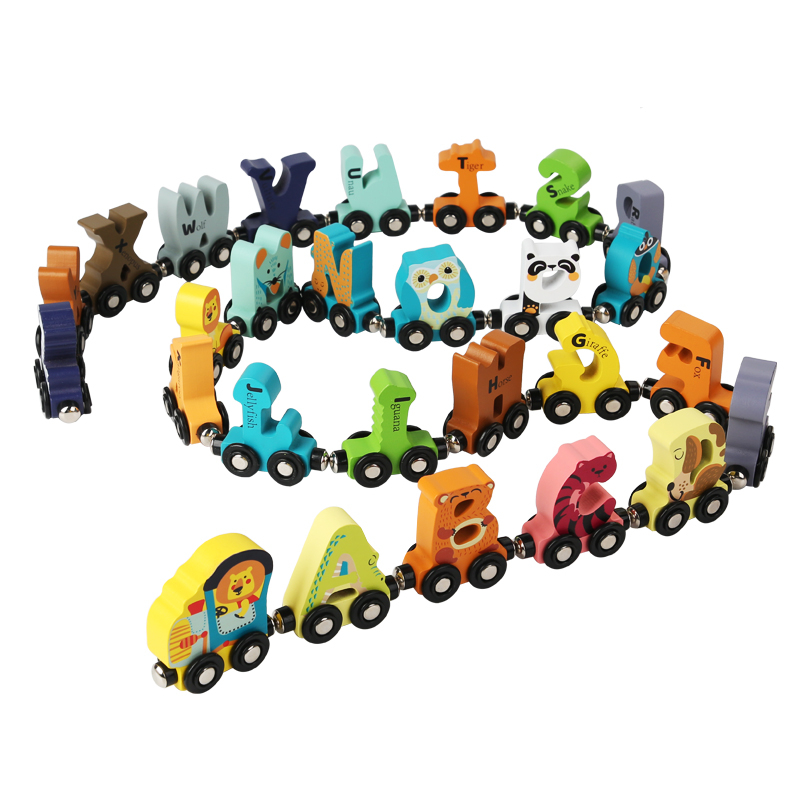 Trenulet magnetic din lemn cu litere si animale - joc educativ