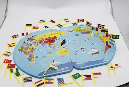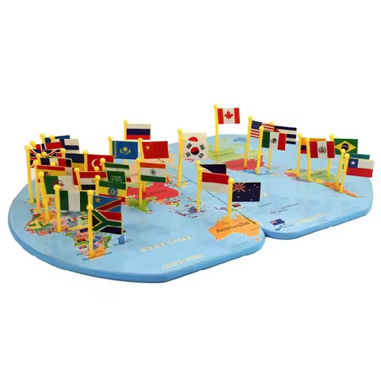 Aceasta harta a lumii din lemn cu steaguri este o jucarie educativa excelenta pentru copiii peste 3 ani. Include 36 de steaguri nationale care se insereaza in locatii prestabilite pe harta, dezvoltand astfel cunostintele despre tari, continente si simboluri nationale.