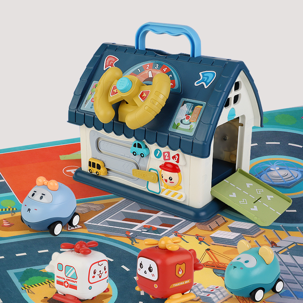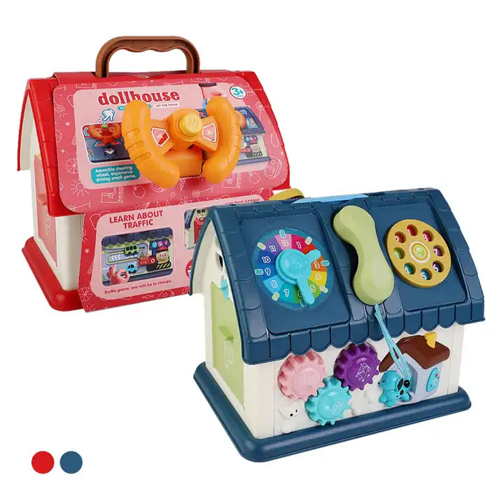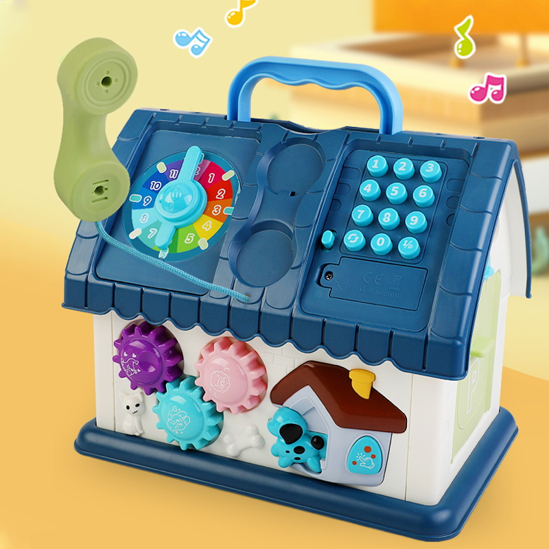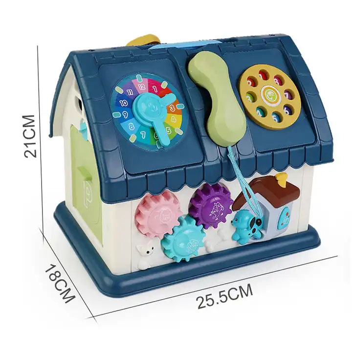 Casuta educativa cu multiple activitati interactive: telefon, ceas, roti dintate, usa care se deschide şi butoane colorate.
