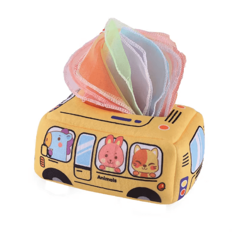 • Cutiuta moale din material textil, cu servetele moi si colorate incluse, ideala pentru joaca senzoriala a bebelusilor.