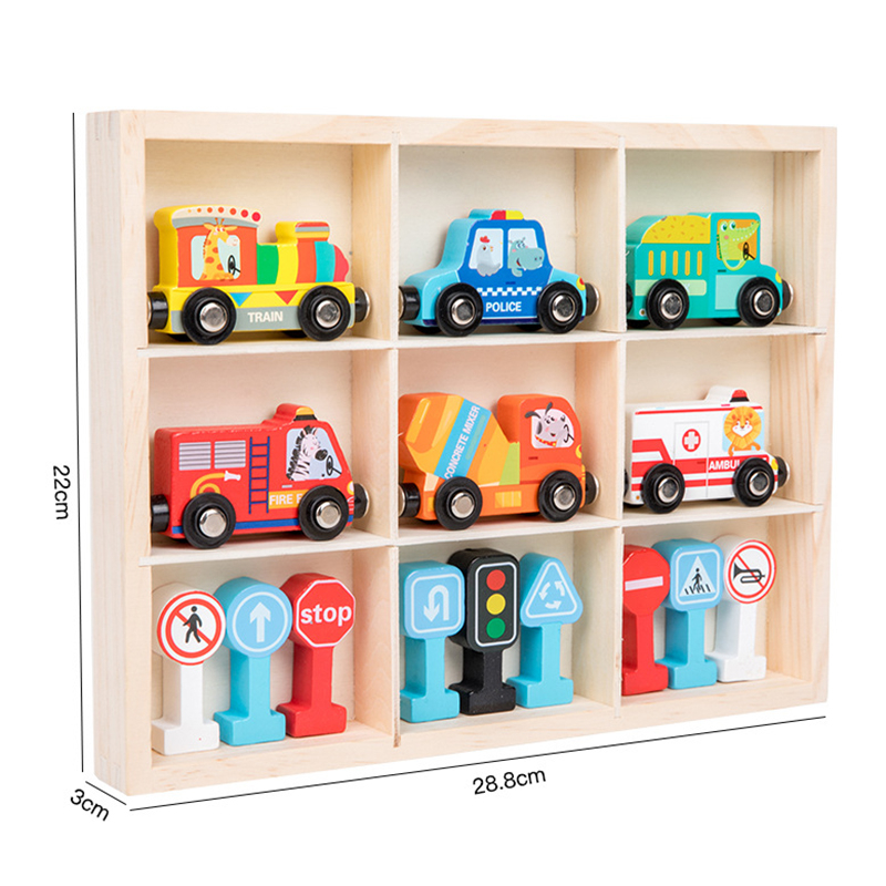 • 6 vehicule magnetice din lemn: tren, masina de politie, ambulanta, pompieri, camion betoniera si utilaj de constructii