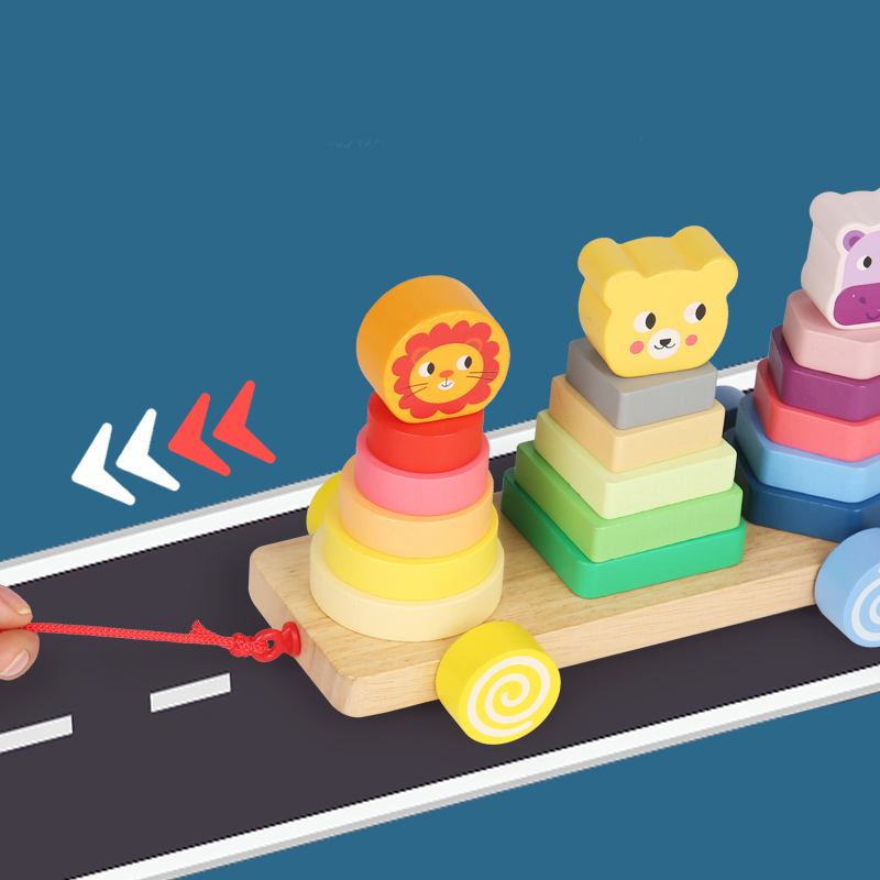 Set din lemn cu forme geometrice multifuncționale, colorate și stivuibile pe roți mobile