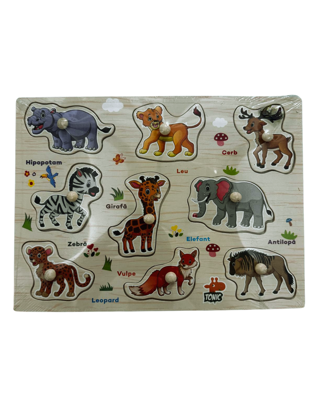Jucarie educativa din lemn pentru copii 3+, ideala pentru invatarea animalelor, dezvoltarea motricitatii fine si recunoasterea vizuala. Fiecare piesa are imagine si denumire in limba romana. Perfect pentru joaca interactiva si invatare prin asociere.