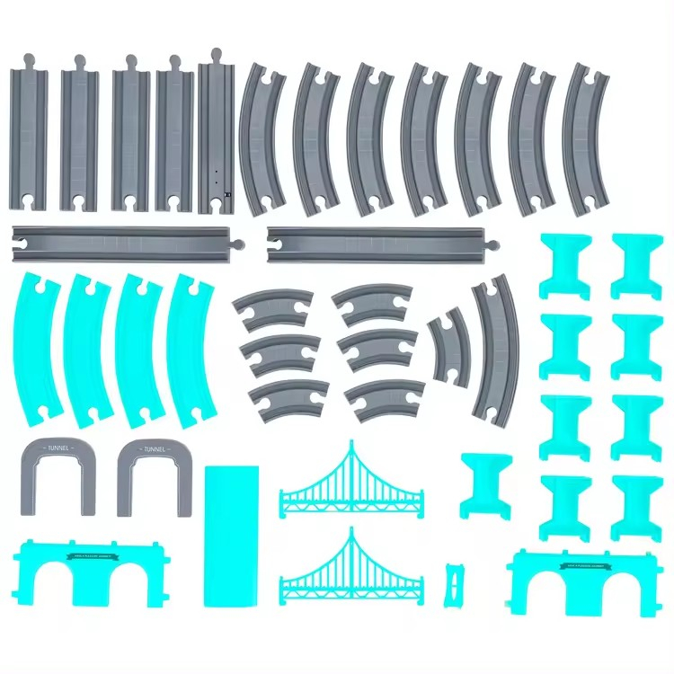Set complet „DIY” cu 92 piese pentru construirea unui traseu de tren electric cu maşini, sine, tuneluri şi accesorii.