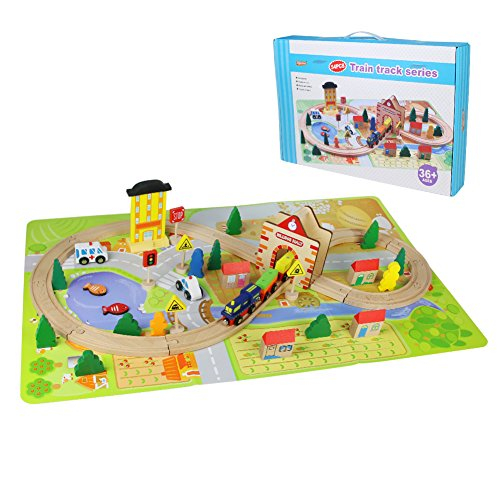 Set educativ din lemn, incluzând șine, vagoane magnetice, tablă planșă și accesorii diverse (copaci, semne, oameni, clădiri)