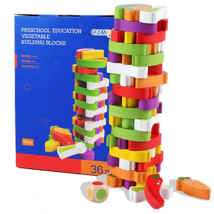 Joc Jenga din lemn cu legume, turn de echilibru - multicolor